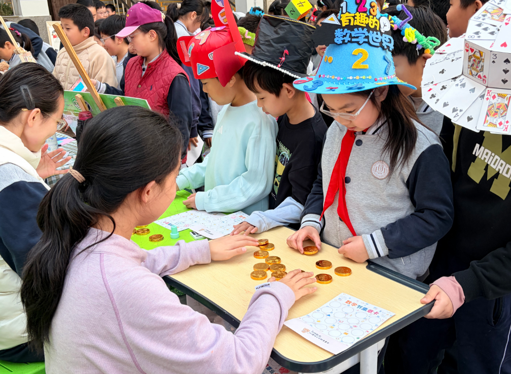 活动当天,小操场化身为热闹的数学乐园,25个摊位聚焦不同数学素养点,构成多元闯关体验。在空间思维类摊位,魔尺、方块拼图、汉诺塔等游戏备受青睐,孩子们通过拼接、移动、规划,将抽象的空间概念化为具体操作,完成挑战时脸上洋溢着成就感;运算推理类摊位同样人气高涨,24点、数独、巧移火柴棒等游戏,让孩子们在快速计算与逻辑推理中提升数学思维能力,大家时而凝神思考,时而小声讨论,沉浸在解题的乐趣中;感知体验类摊位则充满创意,舒尔特纸杯、图形摸摸箱、听鼓抢数等游戏,锻炼孩子们的专注力、感知力与反应速度,现场不时传来阵阵欢笑与欢呼。